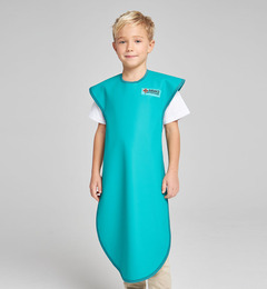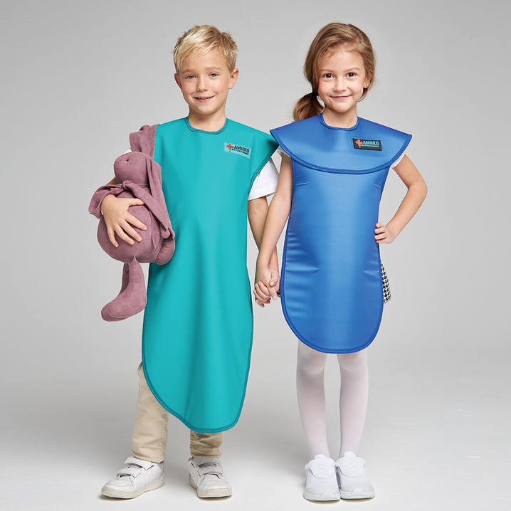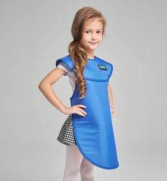 Фартук односторонний рентгенозащитный детский производства Амико защищает тело ребенка ростом 120–134 см спереди, включая плечевой пояс, от области горла до голеней. Возможные варианты: Винил, свинцовый эквивалент: 0,35 мм Pb. Резина, свинцовый эквивалент: 0,35 мм Pb.